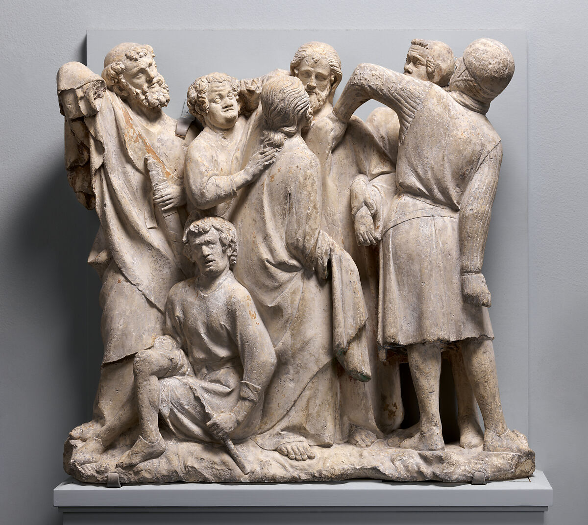 This one represents the tumultuous moment before Christ’s death. In the center, we see Judas, his back turned from us as he leans in to kiss Christ in his infamous act of betrayal. On the far right, Roman soldiers prepare to arrest Christ. If you bend over and peek beneath the hem of the soldier on the far right, you can see passages of the bright colors that once covered the entire relief. On the far left is St. Peter, with his arm raised, withdrawing a sword that he just used to sever the ear of Malchus, the figure seated beneath him. Walk around to the left of the sculpture and find Christ’s hand as he reattaches Malchus’ ear. Amid the aggression and brutality of this charged scene, a powerful act of healing and compassion takes place.