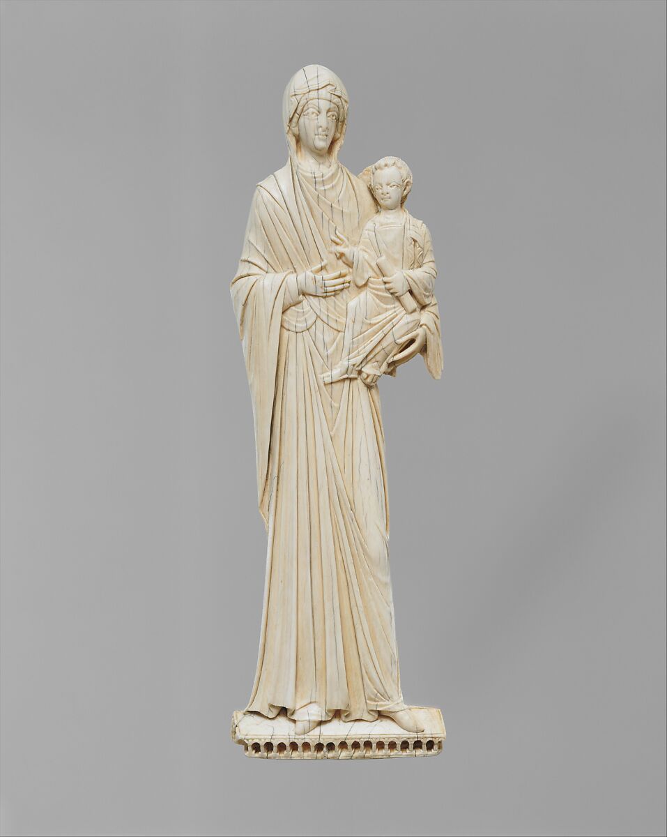 This statuette, carefully cut from an ivory plaque, follows a widespread Byzantine image type called the Hodegetria, in which the Virgin supports the Christ Child with her left arm. It takes its name from an icon housed in the Hodegon Monastery in Constantinople.