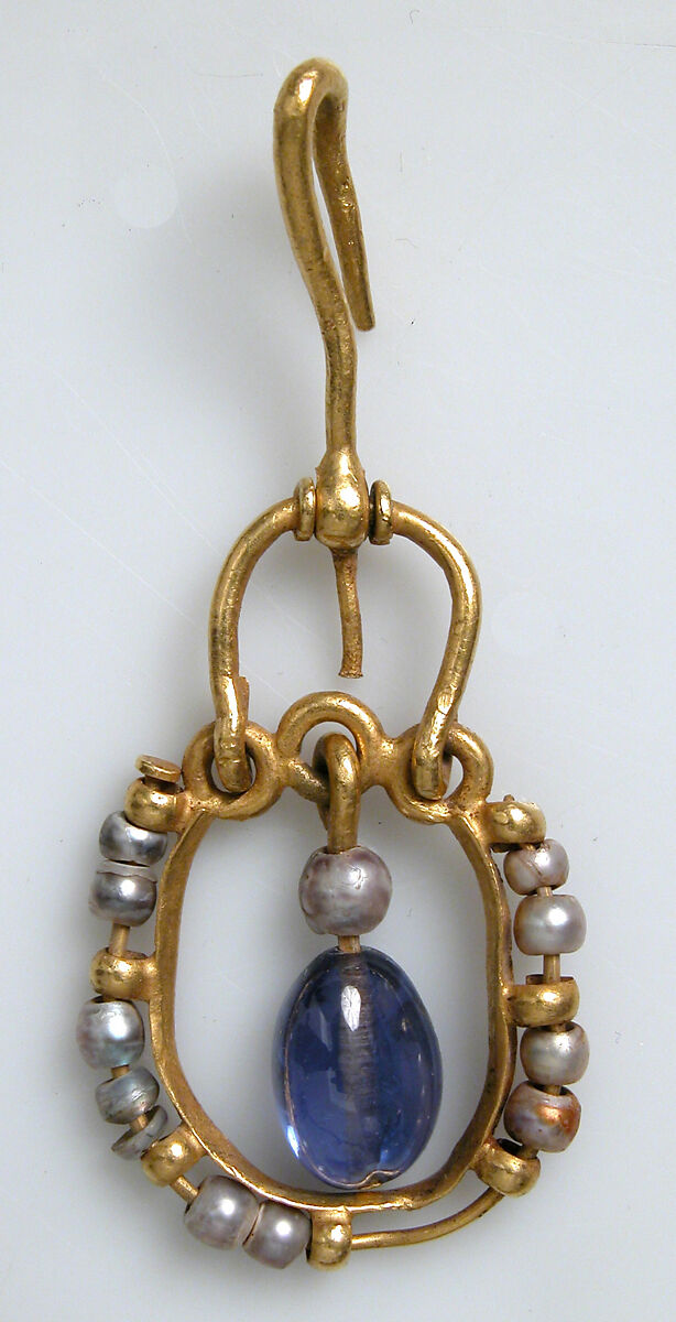 These elegant earrings are decorated with pearls, a favorite jewel of the Byzantines. Sapphires, then called hyakinthoi (hyacinths), became popular in Byzantine jewelry in the sixth century.