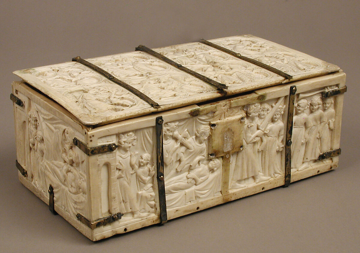This casket is one of six depicting La Châtelaine de Vergi, a story of love and death reportedly based on a scandal at the Burgundian court. It concerns the secret affair of a knight and a lady (la châtelaine) that is ended by the jealous duchess of Burgundy.