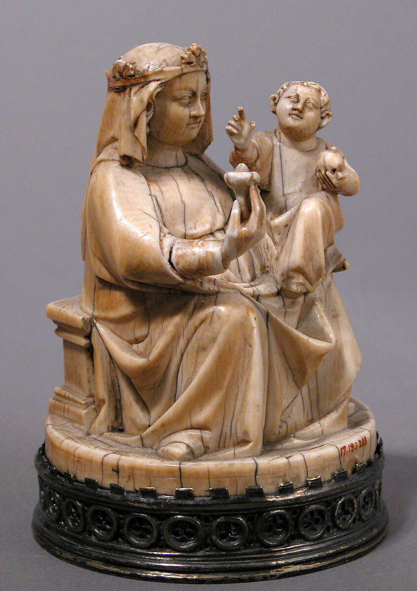 This statuette depicts Jesus and his mother as the agents of human redemption. The rose Mary holds symbolizes her birth as that of the purest flower among the thorns of sin sown by Eve. The apple held by the blessing infant Jesus signifies his identity as the new Adam.