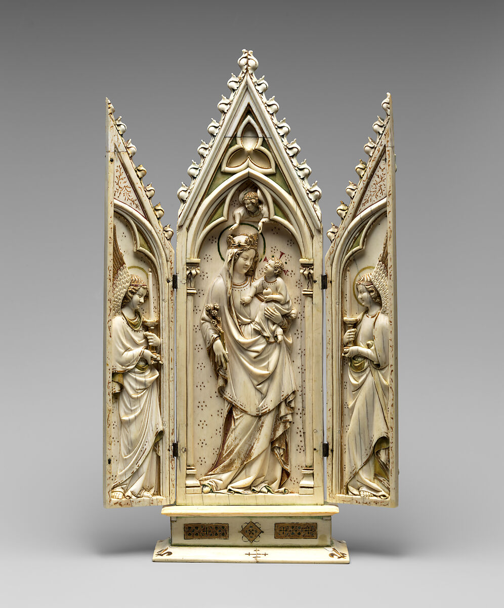 The stylistic character of this carving is consistent with contemporary Cologne representations of the Virgin and Child in other media, namely in glass painting and sculpture in wood and stone. In this rendering of a popular composition, an angel has just crowned Mary as the Queen of Heaven. The triptych is one of the finest examples of ivory carving from Gothic Cologne.