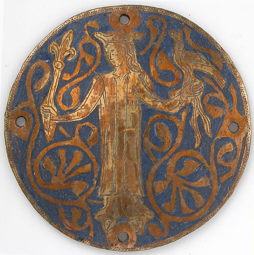 - Medium: Copper: engraved and gilt; champlevé enamel: medium and light blue and white