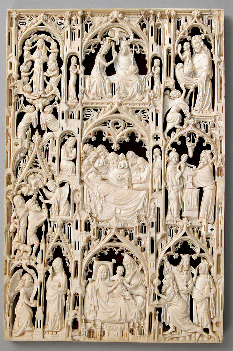 This dense carving depicts scenes associated with the Redemption of Man. The left section of the diptych contains images from the Life of Christ, including Christ’s Betrayal, Crucifixion, and Resurrection. In the upper register is shown, from left to right, God the Father receiving his son, Christ between Justice and Mercy, and Saint Michael weighing souls. On the right are images of the Virgin’s role in man’s redemption, including the Annunciation and Nativity, as well as her Death, Assumption, and Coronation by Christ.