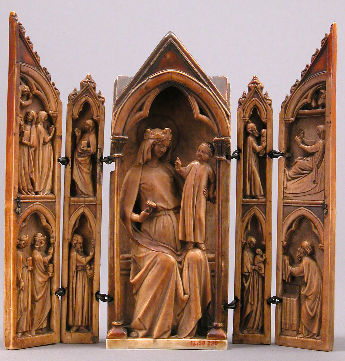 The central statuette shows Mary appearing as the Queen of Heaven with the standing Christ Child blessing the approaching Magi on the wings. The right wing focuses on the role of Joseph, who presents the infant Christ to the Virgin, followed by the Presentation in the Temple below.