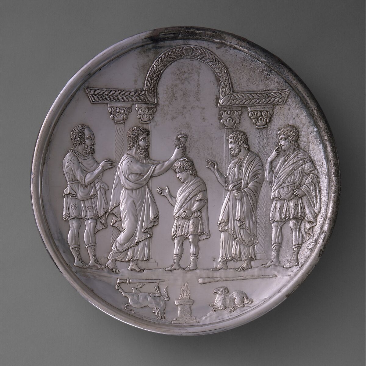 In 628–29 the Byzantine emperor Herakleios (r. 610–41) successfully ended a long, costly war with Persia and regained Jerusalem, Egypt, and other Byzantine territory. Silver stamps dating to 613–29/30 on the reverse of these masterpieces place their manufacture in Herakleios’s reign. The biblical figures on the plates wear the costume of the early Byzantine court, suggesting to the viewer that, like Saul and David, the Byzantine emperor was a ruler chosen by God. Elaborate dishes used for display at banquets were common in the late Roman and early Byzantine world; generally decorated with classical themes, these objects conveyed wealth, social status, and learning. This set of silver plates may be the earliest surviving example of the use of biblical scenes for such displays. Their intended arrangement may have closely followed the biblical order of the events, and their display may have conformed to the shape of a Christogram, or monogram for the name of Christ.
