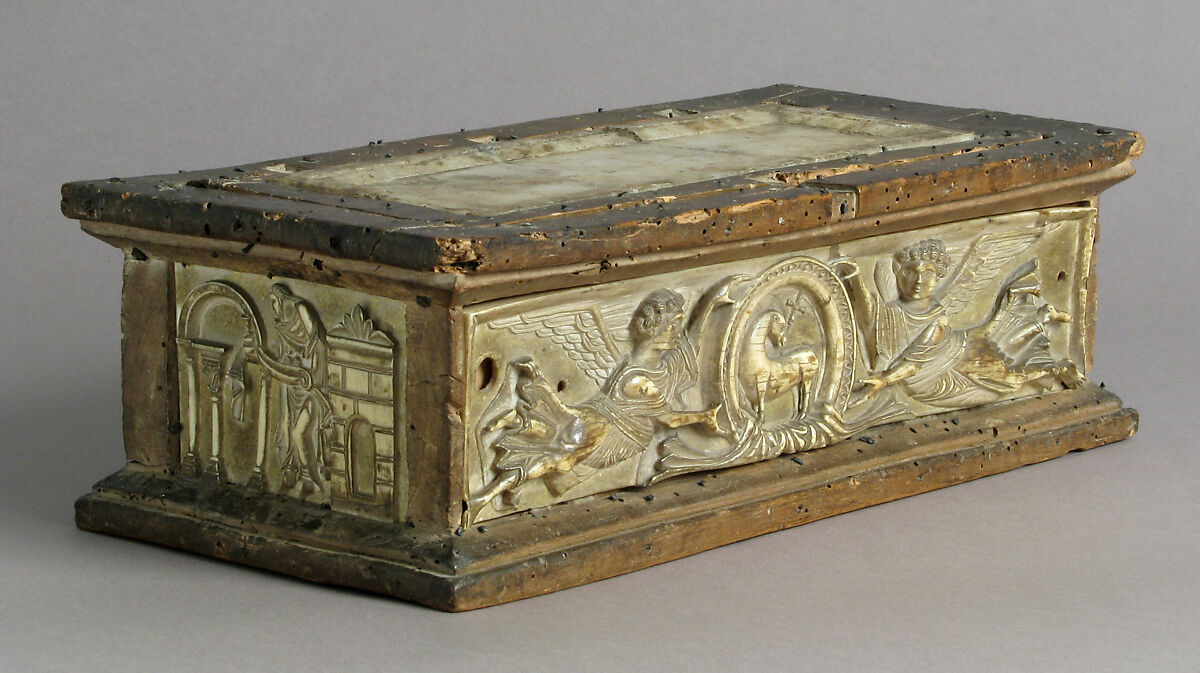 - Medium: Elephant ivory, shell gold, wood box, stone inset on lid