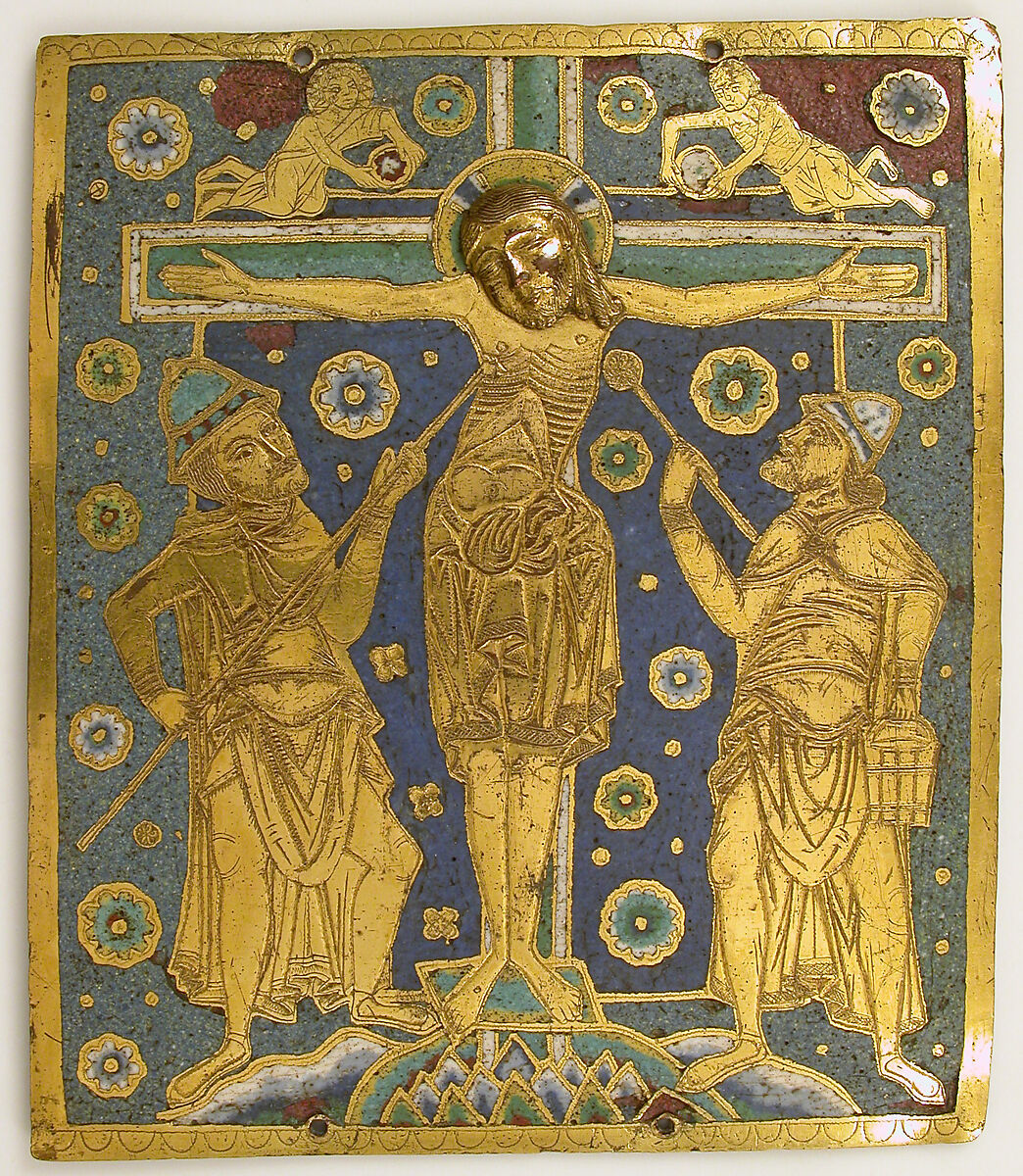 This plaque was probably originally part of a pulpit or altar frontal. An enamel palette of blue, green, red, and white and lively engraving delineate the figures and their clothing. Contemporary enamels from the Limoges region of France inspired the composition.
