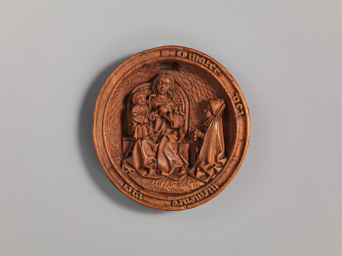 The paired medallions of this relatively modest carving not only illustrate the use of boxwood prayer beads but also seem to echo the recommendation of the fifteenth-century Dominican theologian Alanus de Rupe for praying the Rosary. He advised that the first fifty prayers be said before an image of the Virgin and Child and the second fifty before an image of Jesus crucified. Here, the robe of the woman kneeling in prayer, a string of beads in hand, touches that of Mary, and Jesus looks straight at her. Does she kneel before a statue, an image in her own head, or a miraculous apparition? In the companion image, Mary, Saint John, and Mary Magdalene mourn the death of Jesus. Devotion has caused the collapse of time and space.