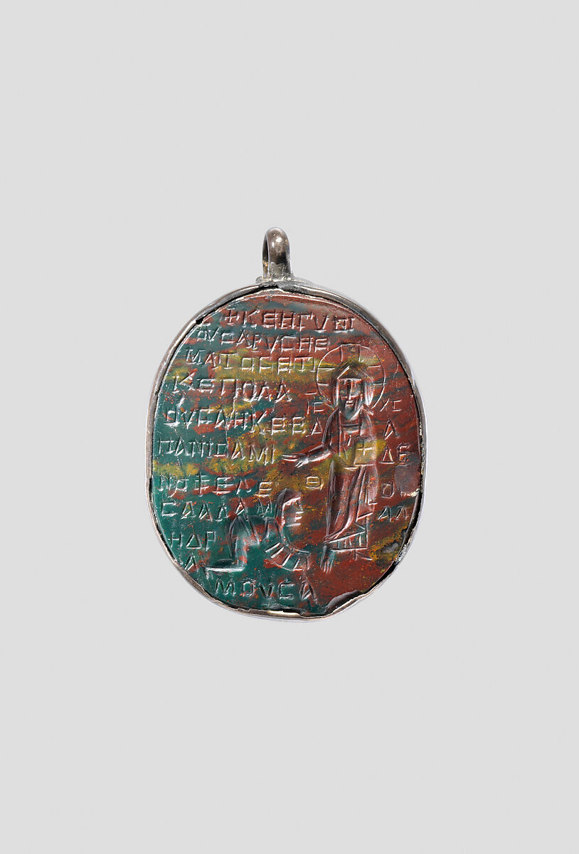 Inscriptions identify the subject of this amulet as the Woman with the Issue of Blood (Mark 5:25–34; Luke 8:43–48). On the reverse a woman stands in the orant (prayer) pose. Hematite was believed to stop the flow of blood and was a favorite medium for amulets related to female reproductive health and menstrual problems.