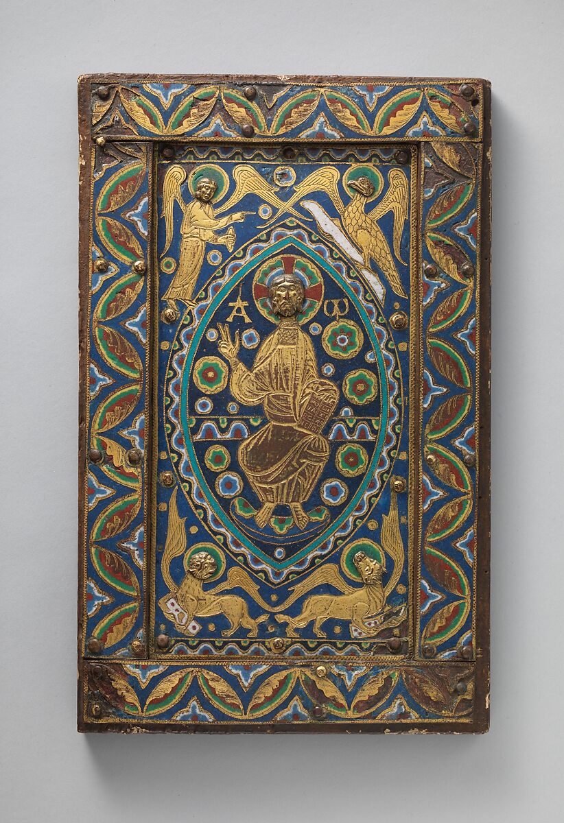 The importance of scripture in Christianity is such that the book becomes an attribute of God himself. Here Christ is poised majestically in the heavens, surrounded by winged symbols of the authors of the four gospels, two of whom clutch books. This book cover is typical of more than a hundred surviving examples created in Limoges, France in the early 13th century. Luxurious in appearance, such book covers, made from enameled copper plaques, were a relatively sturdy and affordable alternative to silver or gold. Few book covers of Limoges work are still attached to manuscripts, but those that are can be found on gospel books across Europe: in Cracow, Germany and France.