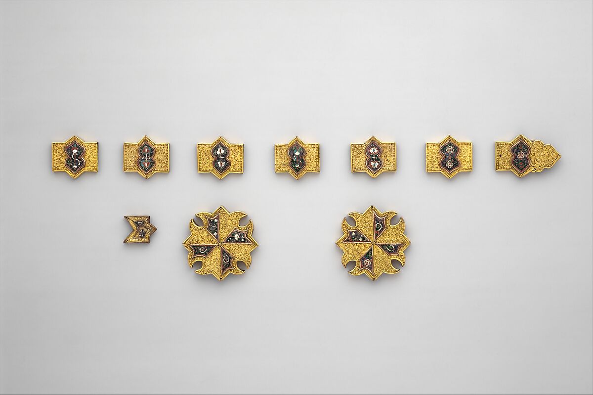 Colorful plaques of cloisonée enamel set into intricate patterns of filigree and granulation adorn this sumptuous group of ten ornaments, components of a larger set that may have decorated an elaborate horse bridle or perhaps a sword belt. Their design and decorative techniques link them to other pieces of fine metalwork made in the Nasrid capital of Granada, presumably in a royal workshop.
