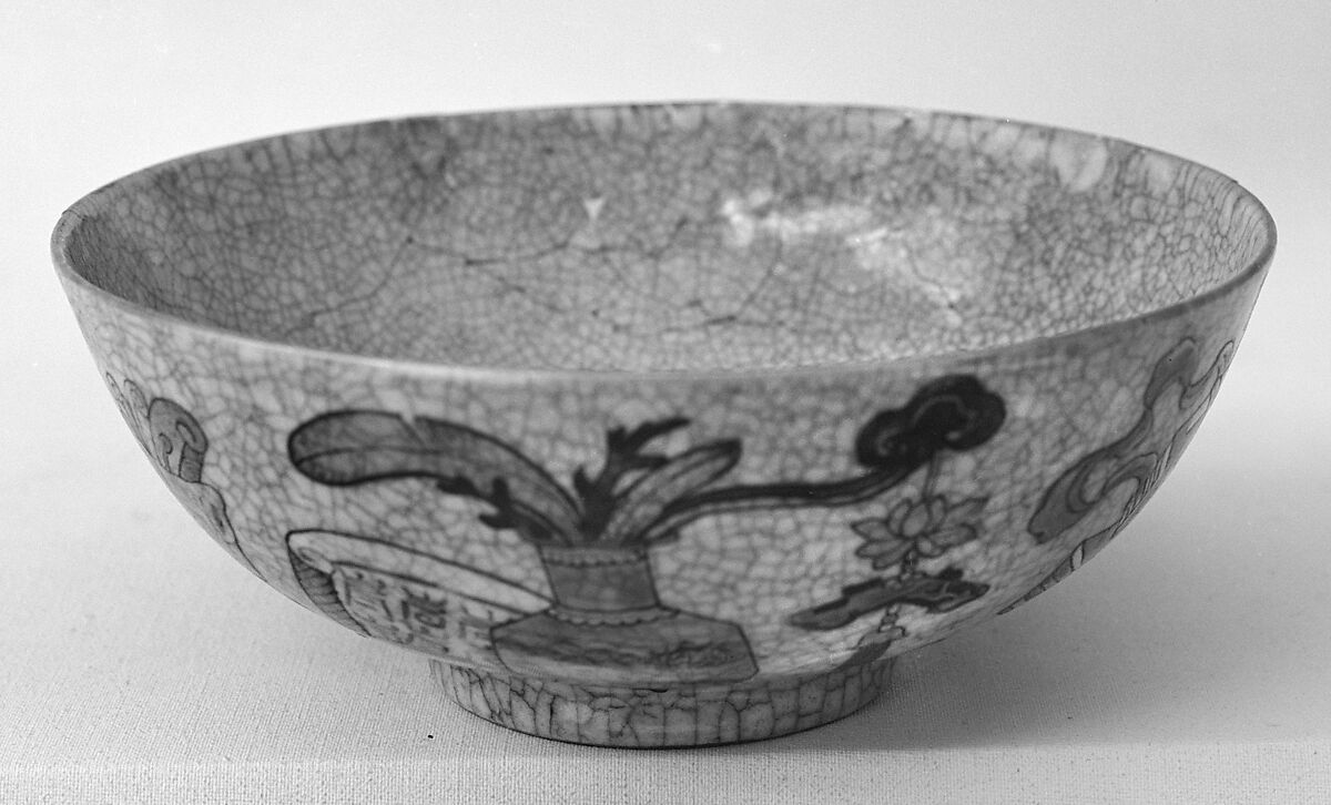 - Medium: Porcelain with polychrome enamels over crackled glaze