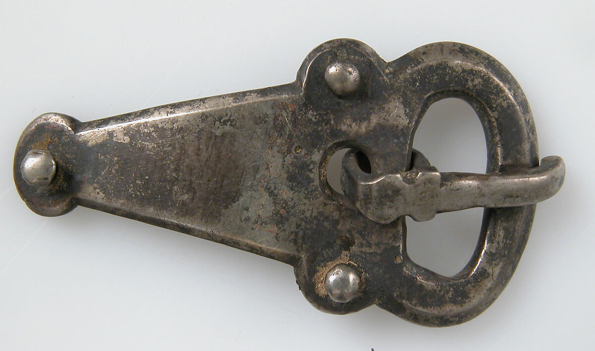 Belts were important features of early medieval dress. Not only did they serve the practical function of holding weapons and tools, but their fittings, which could vary in terms of material, decoration, and size, were also highly visible indicators of rank and status. Iron buckles, many imposing in size, were worn by both men and women. Their intricate decoration was achieved by squeezing narrow twisted strips of silver into patterns engraved on the surface of the prefabricated iron pieces. A complete belt would have consisted of a buckle, a counter plate that was placed opposite the buckle, and sometimes a rectangular plate placed in the middle of the belt at the back for decoration.