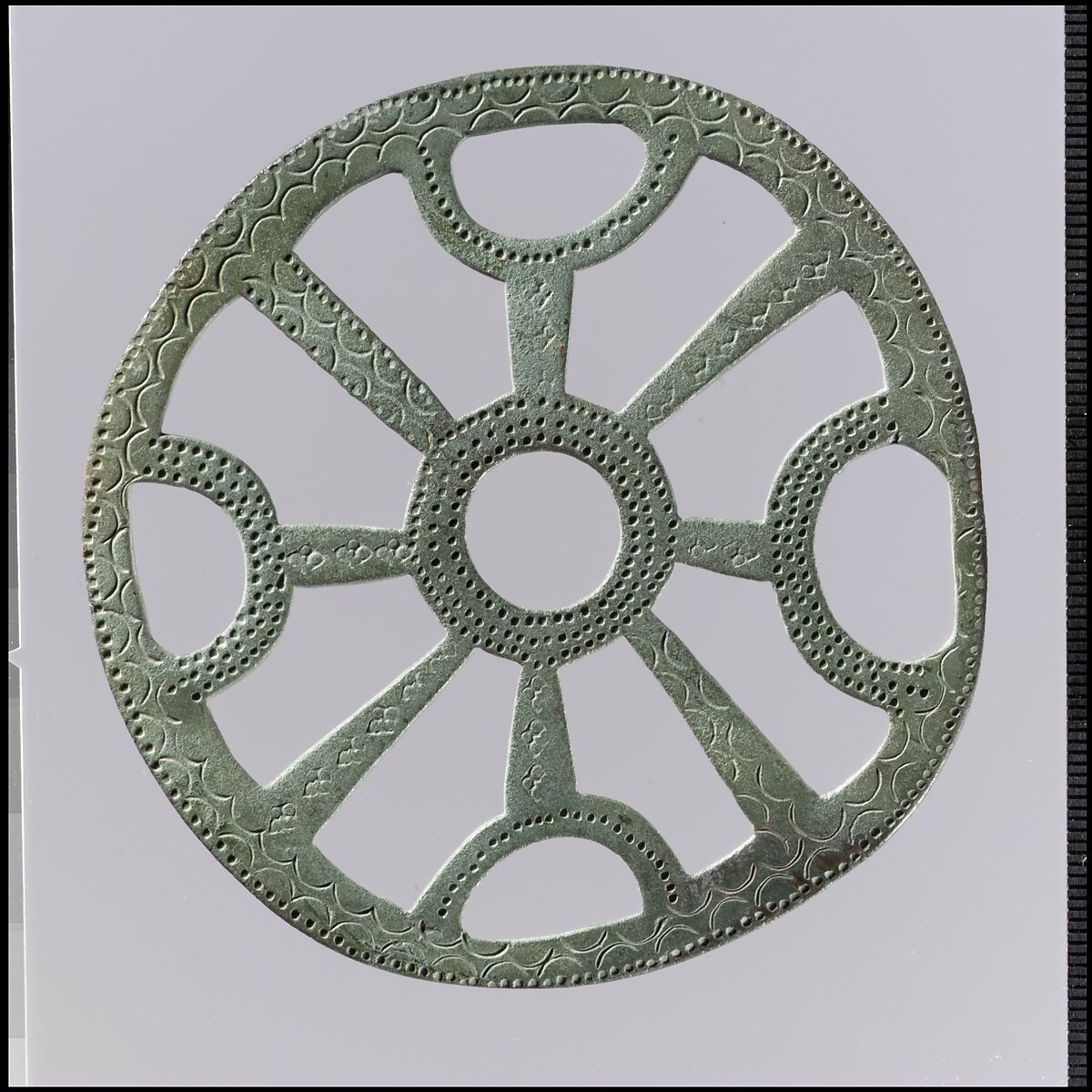 Openwork plaques were hung from a belt by a strap. Such useful objects as combs, keys, or amulets would then be suspended from the plaque by chains or strings. The patterns on these belt fittings ranged from architectural motifs to human figures to abstract designs.
