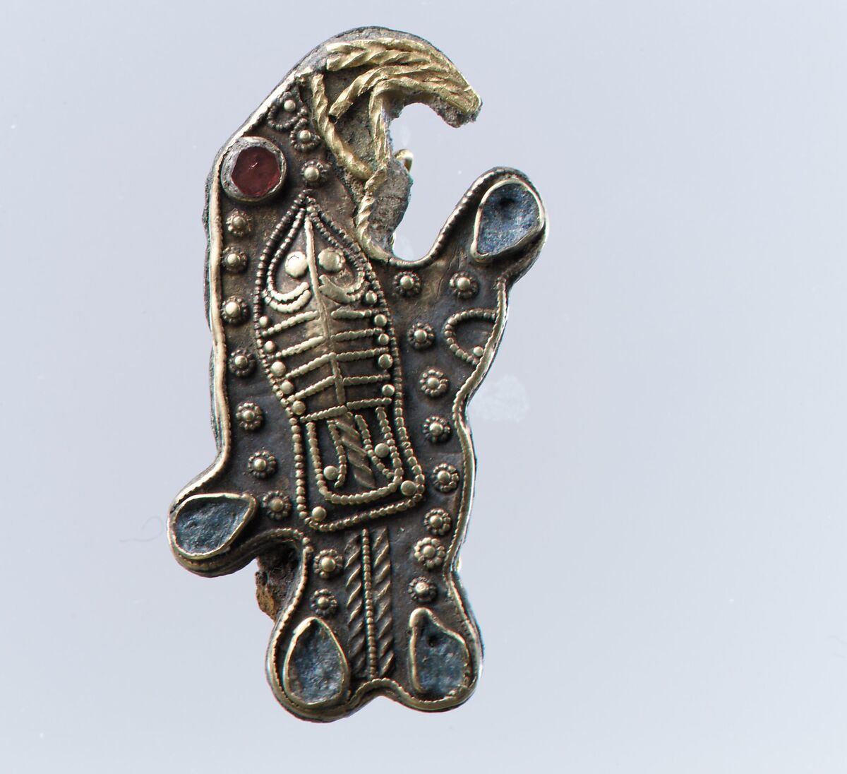 - Medium:Gold sheet with filigree and granulation and inlays of garnet and glass