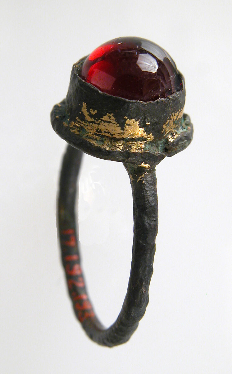 - Medium: Copper alloy, partial gilt, stone or glass paste cabochon
