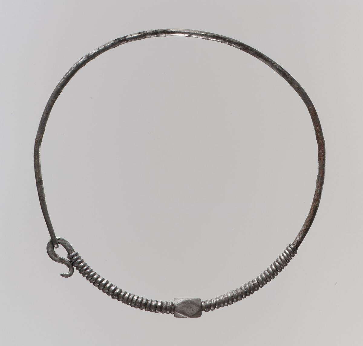 Hoop earrings with polyhedral beads, derived from late Roman jewelry, remained fashionable among Frankish women from the 400s through the 700s. Many are delicate pieces, their beads decorated with garnets or precious stones. Others, often with the least imposing beads, impress by their large hoops and distinctive closures.