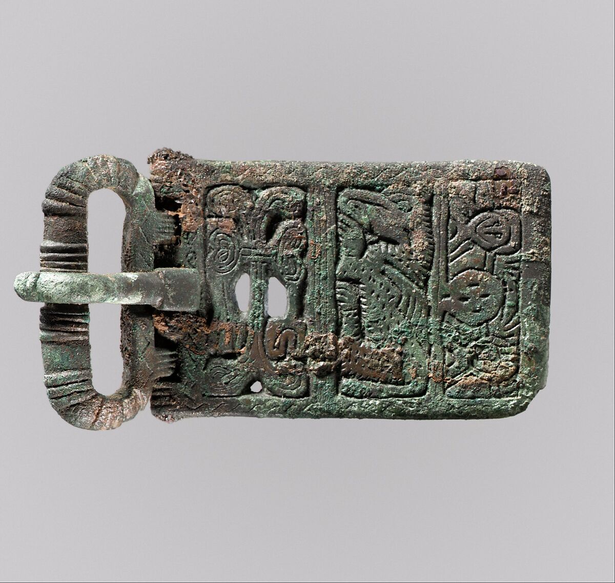 Belts were important features of early medieval dress. Not only did they serve the practical function of holding weapons and tools, but their fittings, which could vary in terms of material, decoration, and size, were also highly visible indicators of rank and status. Iron buckles, many imposing in size, were worn by both men and women. Their intricate decoration was achieved by squeezing narrow twisted strips of silver into patterns engraved on the surface of the prefabricated iron pieces. A complete belt would have consisted of a buckle, a counter plate that was placed opposite the buckle, and sometimes a rectangular plate placed in the middle of the belt at the back for decoration.