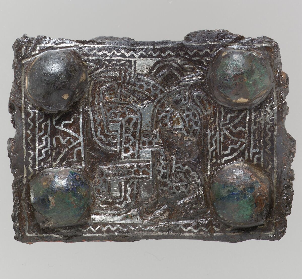 Belts were important features of early medieval dress. Not only did they serve the practical function of holding weapons and tools, but their fittings, which could vary in terms of material, decoration, and size, were also highly visible indicators of rank and status. Iron buckles, many imposing in size, were worn by both men and women. Their intricate decoration was achieved by squeezing narrow twisted strips of silver into patterns engraved on the surface of the prefabricated iron pieces. A complete belt would have consisted of a buckle, a counter plate that was placed opposite the buckle, and sometimes a rectangular plate placed in the middle of the belt at the back for decoration.