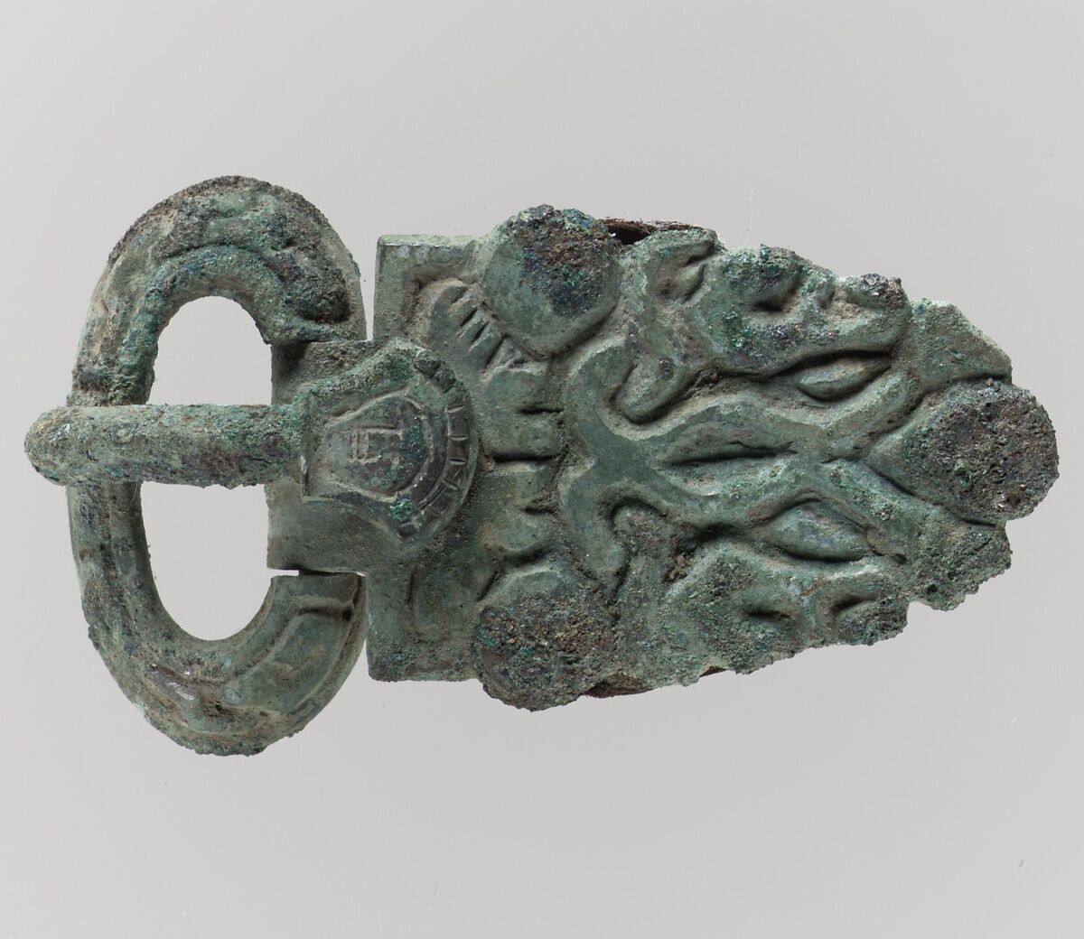 Belts were important features of early medieval dress. Not only did they serve the practical function of holding weapons and tools, but their fittings, which could vary in terms of material, decoration, and size, were also highly visible indicators of rank and status. Iron buckles, many imposing in size, were worn by both men and women. Their intricate decoration was achieved by squeezing narrow twisted strips of silver into patterns engraved on the surface of the prefabricated iron pieces. A complete belt would have consisted of a buckle, a counter plate that was placed opposite the buckle, and sometimes a rectangular plate placed in the middle of the belt at the back for decoration.