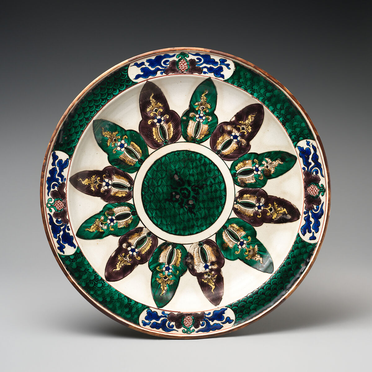 - Medium: Pottery covered with glaze and enameled in five colors (Hizen ware, Kutani type)