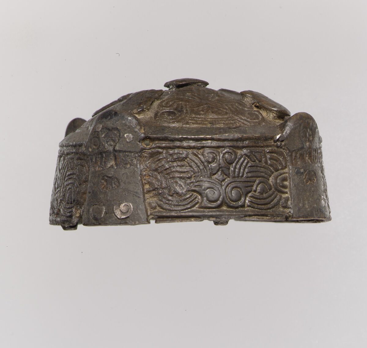 Women on the Scandinavian island of Gotland wore box brooches to secure their shawls at the collarbone; the brooches doubled as a container to hold small objects. This example is decorated with tiny beasts, which inhabit the interlace patterns on the top and sides. Viking art generally eschews figural decoration in favor of lively patterns based on stylized animals.