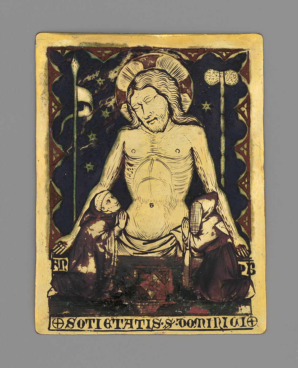 A monk and a hooded figure, his back bared so that he can whip himself in penitence, kneel before a dreamlike vision of Jesus rising from his tomb. This plaque, with an inscription naming the society of Saint Dominic, was probably intended for private prayer by a member of a Dominican brotherhood.