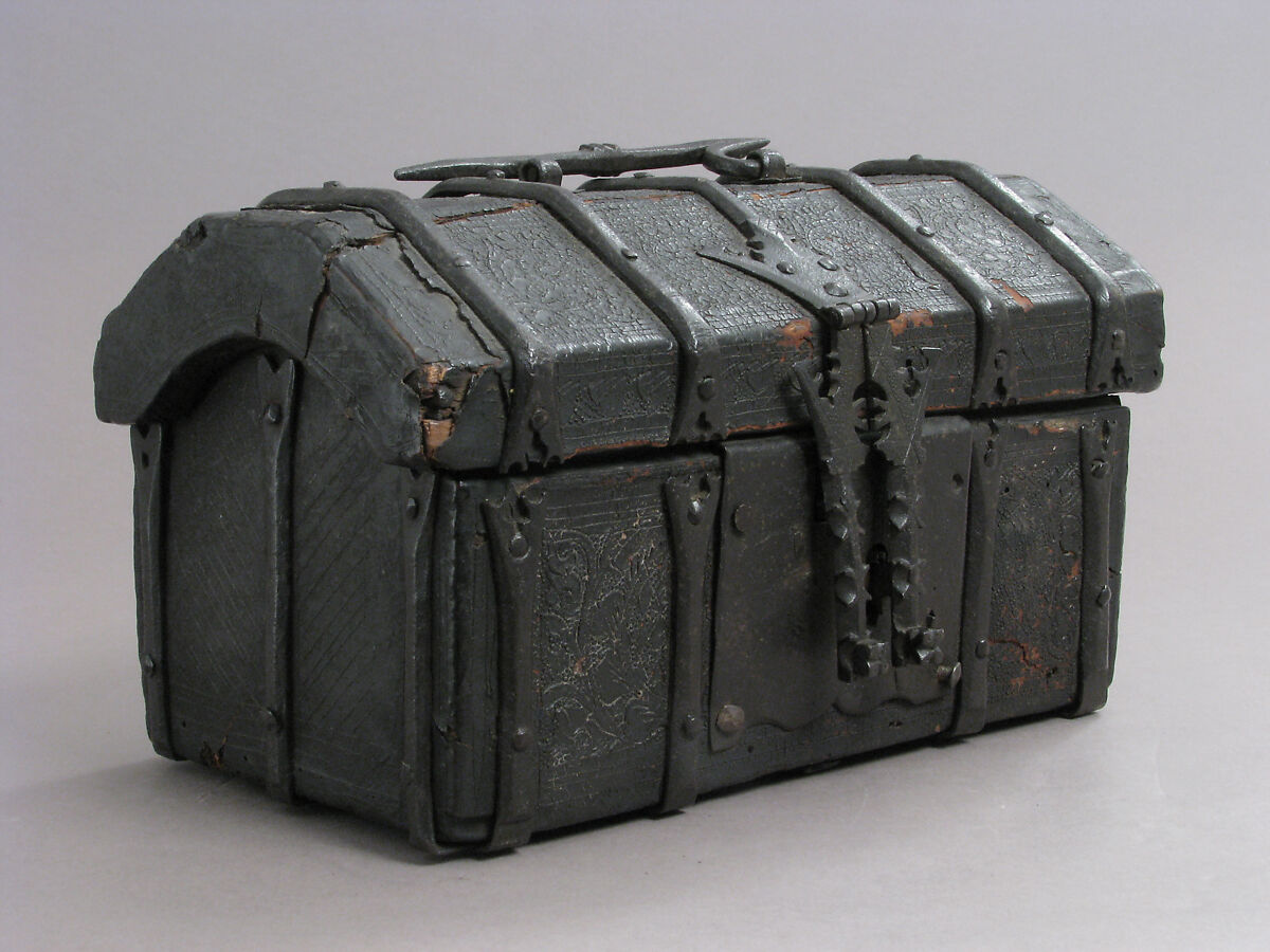 - Medium:Cuir bouilli (tooled leather), iron mounts and lock over wood core