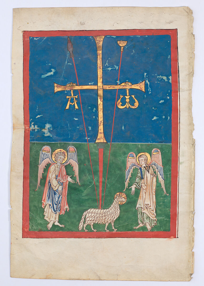 Leaf from a Beatus Manuscript: the Lamb at the Foot of the Cross, Flanked by Two Angels; The Calling of Saint John with the Enthroned Christ flanked by Angels and a Man Holding a Book
