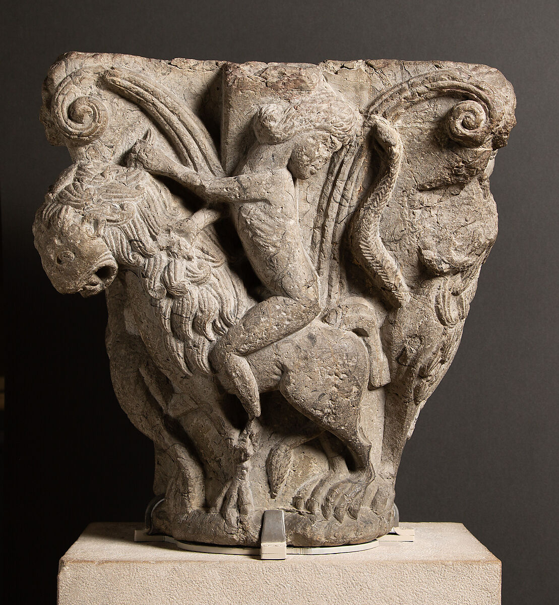 Lions, humans, and snakes encircle this capital in a dynamic composition that transforms the block’s four separate sides into a continuous parade of creatures. The sculptures of ancient Rome, which celebrated the nude form and often incorporated such symbolically powerful beasts as lions and snakes, inspired the creation of this wild and enigmatic object. Many ancient artworks were available to medieval art makers, and western European sculptors working around the year 1100 seem to have studied them particularly closely, though their own creations reveal that they were less interested in directly copying antiquity than in reinterpreting it for their own purposes. For such works, which typically decorated churches, pagan subjects took on new, Christian significances. Though its site of origin is unknown, in its style and choice of subjects this capital is similar to sculptures made for the Cathedral of Jaca in the northern Spanish province of Aragon and for the church of Saint-Sernin de Toulouse in southern France, two sites closely connected across the Pyrenees. Its distinctive stone, which captured tiny, fossilized marine creatures, is quarried on both sides of these mountains.