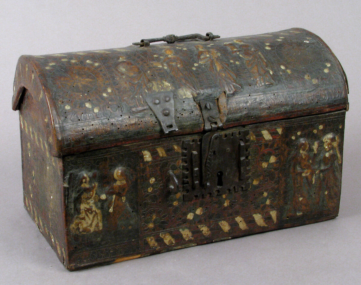 - Medium: Leather, (stamped and tooled) with polychromy, metal fittings