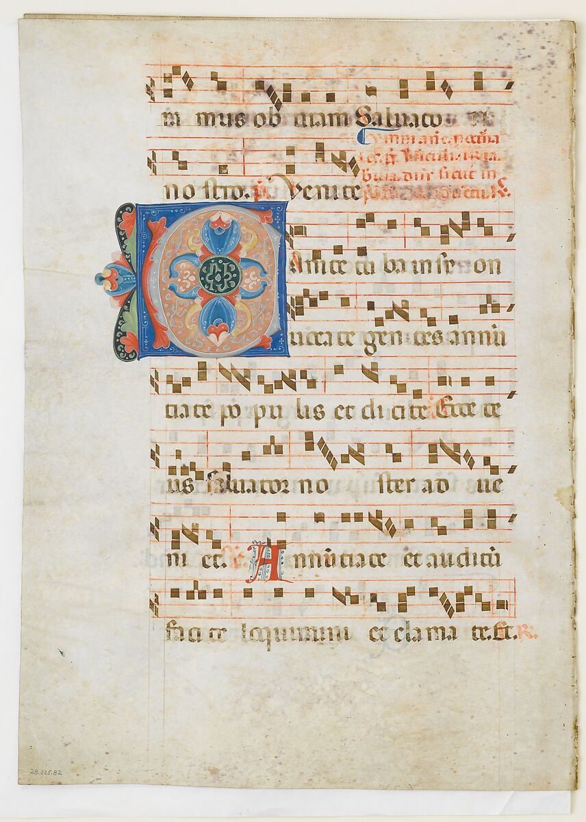 The schematized floral pattern in the letter of this Bolognese leaf closely resembles the motifs in the cutting by Nerius shown nearby. The chant "Sound the Trumpet in Zion" was inspired by the writings of the prophet Joel and is sung on the fourth Sunday of Advent, immediately before Christmas.