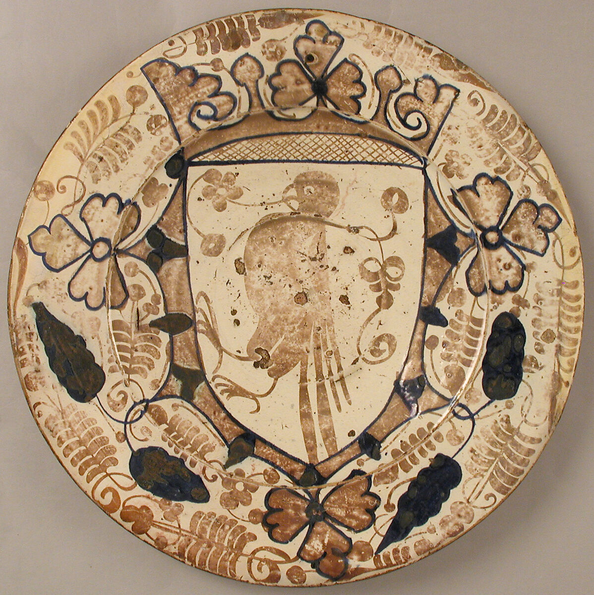 Knowledge of the technique for creating lusterware made its way to the Iberian Peninsula by the twelfth century, when most of the region was still under Islamic rule. By the 1400s, the Iberian center of lusterware production was in Manises, near the city of Valencia. Previously a Muslim taifa, or principality, the Kingdom of Valencia was conquered in the thirteenth century by James I for the Crown of Aragon, and it was here that Christians and Muslim potters worked, sometimes together, for a diverse clientele with a voracious appetite for high quality lustered wares.