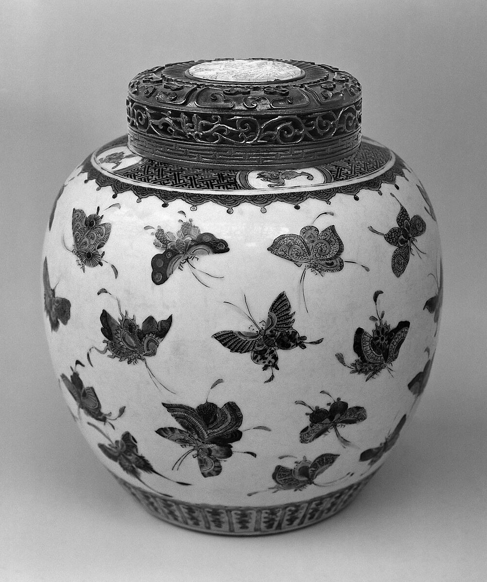 - Medium:Porcelain painted in overglaze polychrome enamels (Jingdezhen ware), wooden cover inlaid with jade