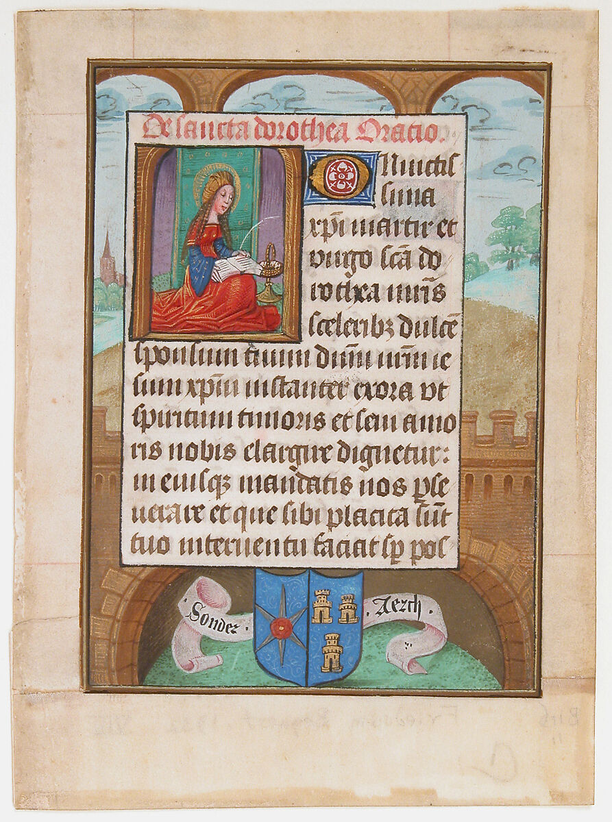 Dressed as a middle class woman with a book in her lap, Saint Dorothy appears at the beginning of a prayer in her honor. The coat of arms and motto ("God be kind to us, luck fails ever so often") at the bottom of the leaf are of an unidentified Flemish family.