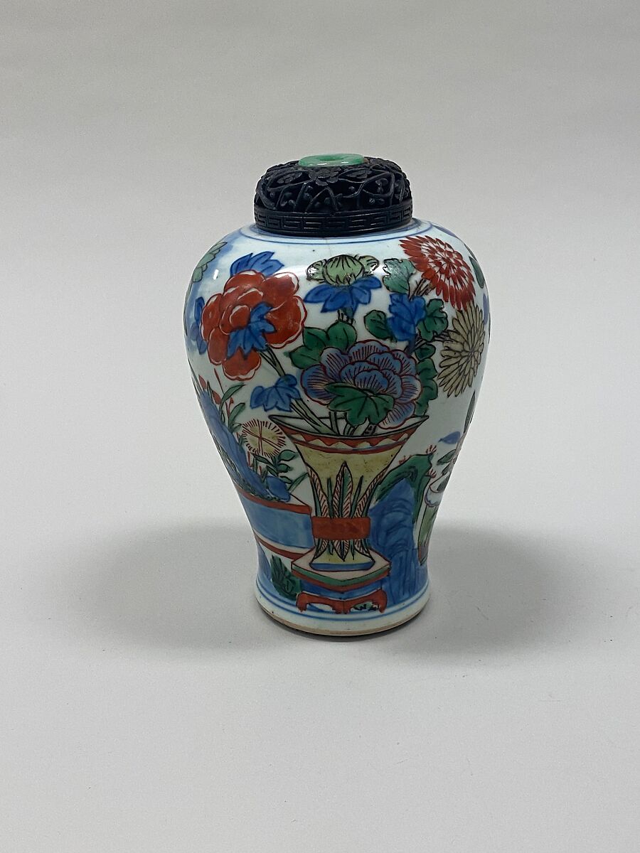 - Medium: Porcelain painted with underglaze cobalt blue and overglaze polychrome enamels (Jingdezhen ware)