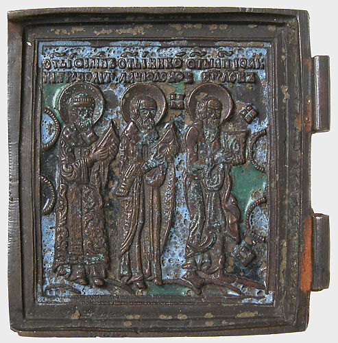 - Title:Panagiarion with the Virgin and Child and the Three Angels at Mamre (interior) and the Crucifixion and Three Church Fathers (exterior)