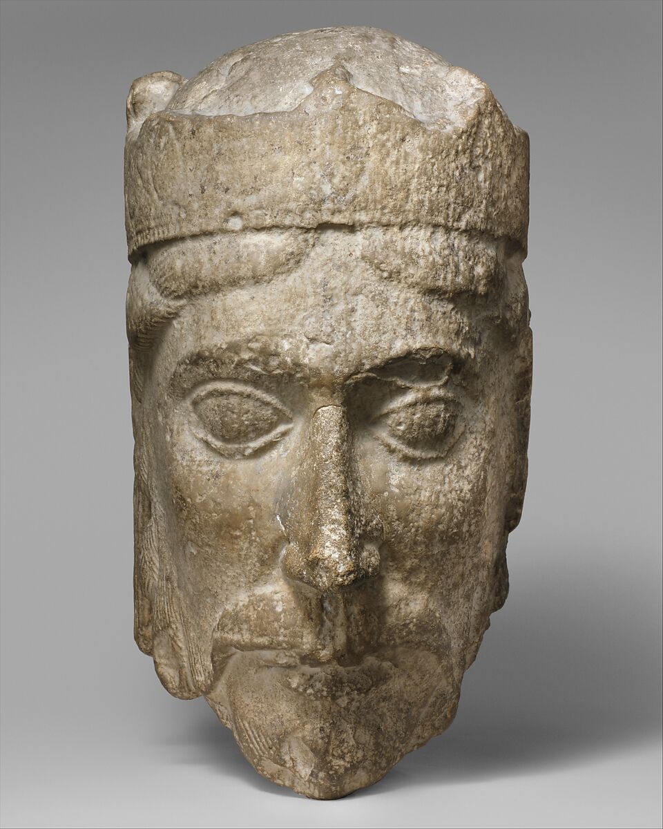 A recently discovered photograph taken about 1906–10 seems to confirm earlier speculation that this head comes from Notre-Dame-dela-Couldre in Parthenay. Following the French Revolution, the church was secularized, sold, and demolished by its new owner. Certain aspects of this sculpture, such as the striated hair and the thick upper lip, are characteristic of Parthenay production. Although its original placement and identification remain unknown, the head may have belonged to a large figure on horseback, set in profile, on the church’s façade.