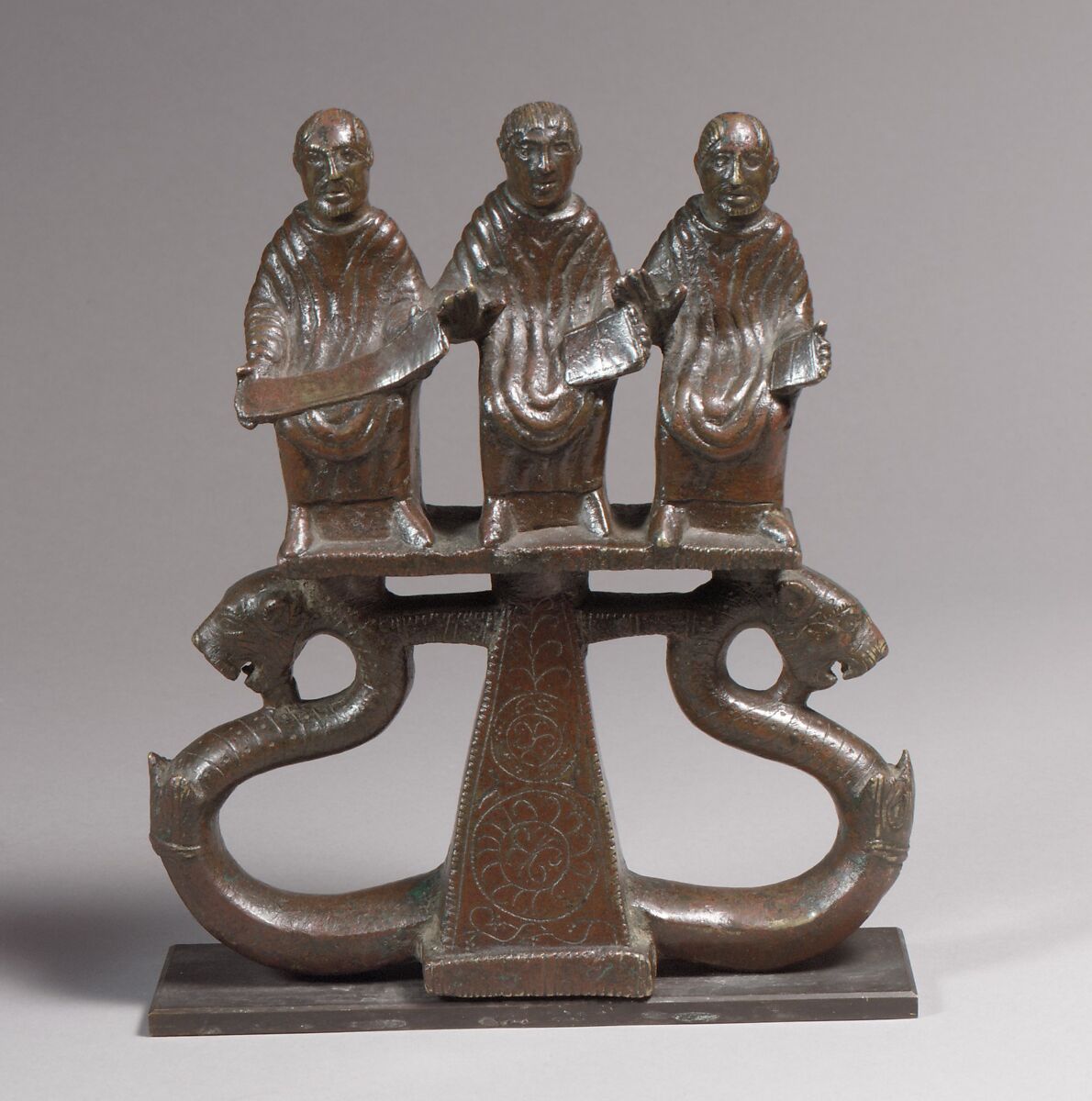 The men who adorn this chariot mount are probably two orators and a grammarian, as suggested by their gestures and by the scrolls and writing tablets they hold. The piece may have been used to decorate the chariot of a distinguished orator in Gaul.