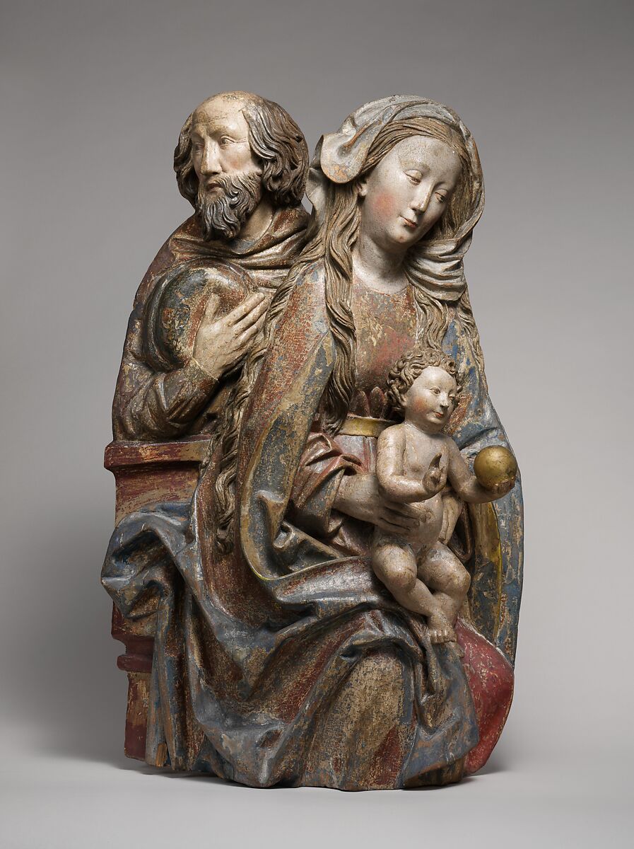 This engaging group of the Virgin and Child with Saint Joseph was once the centerpiece of a large altarpiece. The Virgin and Child face in the same direction as the Child raises his right hand in blessing. Their posture suggests they may have been part of Holy Kinship group with Saint Anne or of an Adoration of the Magi. The orb in his left hand symbolizes Christ’s role as spiritual ruler of the world.