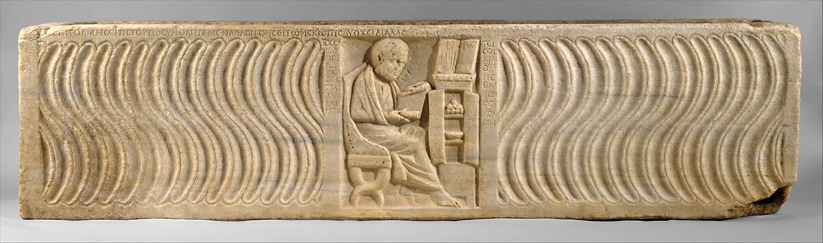 The tomb's owner is shown seated with an open scroll, the pose of a philosopher, demonstrating that he is a learned man. His profession can be identified by the open case containing surgical tools on the cabinet top. Other scrolls and a basin for bleeding patients within the cabinet offer further proof of his profession. The style of his dress and the language of the inscription indicate that he was one of the many Greeks living in Italy. Beginning in the 300s, Christians would adopt in their art the philosopher pose and the undulating motifs, or strigils, that appear on the sides of the sarcophagus.
