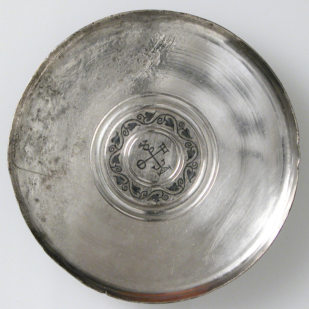 Plates like this were made in sets for use in wealthy homes. The Greek letters at the ends of the cross-shaped monogram may refer to the owner, Theodore A(?). The control stamps on the back of the plate date it early in the reign of the emperor Heraclius (610–41).