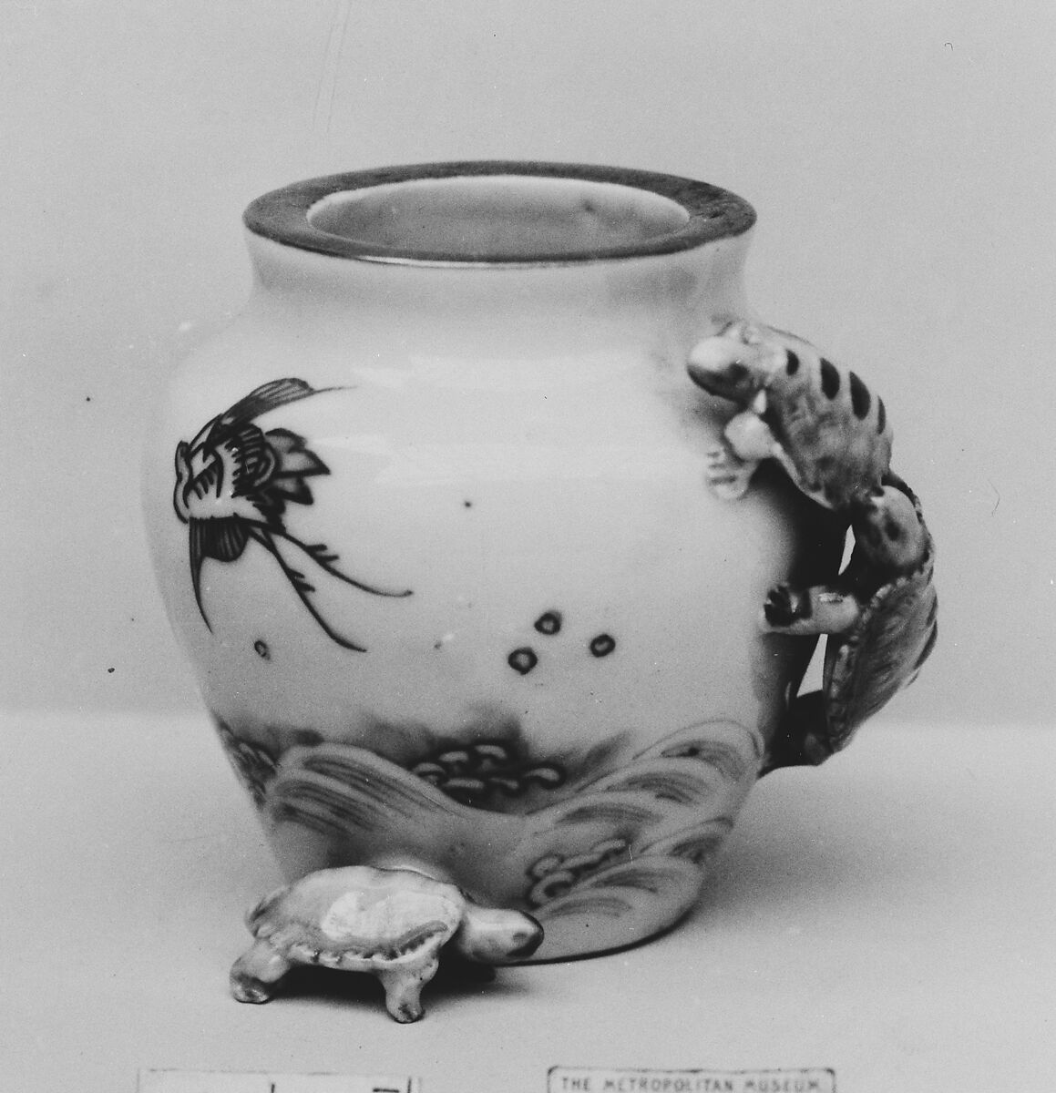 - Medium: White porcelain decorated in blue under the glaze, and gold