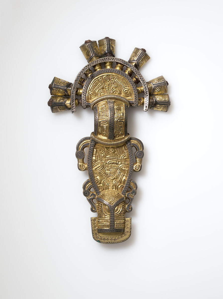 The menagerie of zoomorphic creatures here, with ribbonlike bodies and heads with long jaws, characterize Langobardic jewelry in the 500s and early 600s. Animal heads project from the edges, and a stylized human face is hidden on the back.