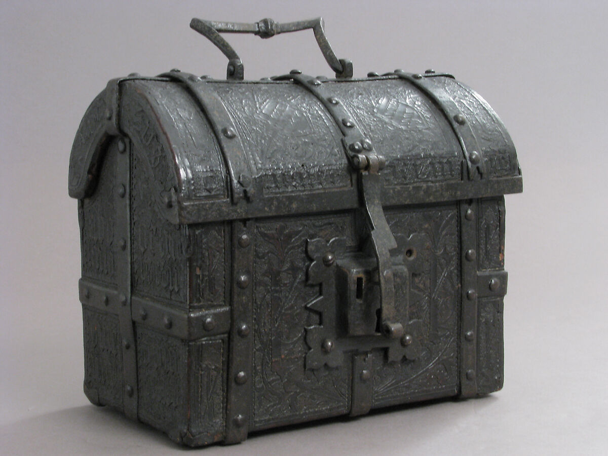 - Medium: Cuir bouilli (tooled leather), iron fittings, wood core