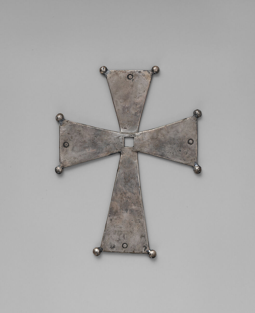 This elegant silver cross has flared arms ending in serifs. Similar crosses were given to churches and shrines as votive gifts.
