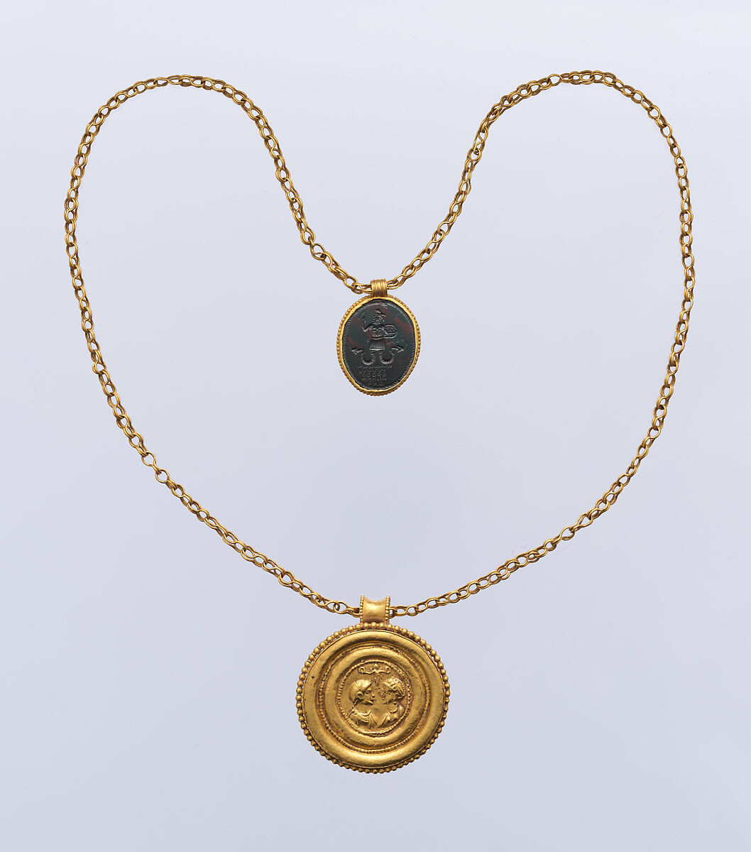 The marriage of the two figures on the gold pendant is blessed by Christ who holds wreaths over their heads, a Christian variation of a pagan motif. The hematite pendant with its solar deity was probably attached for its healing qualities.