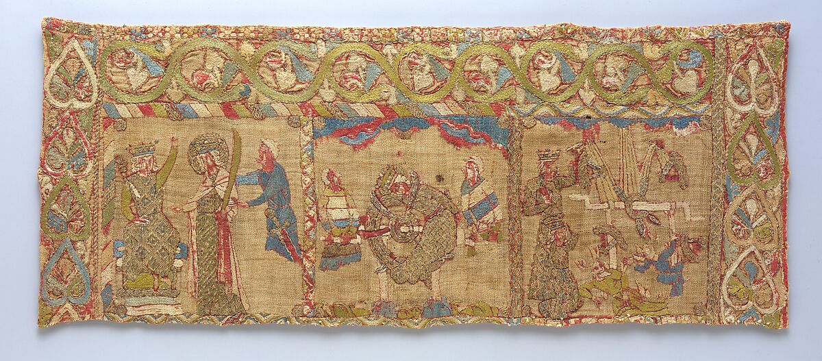 This embroidery traces the legend of the martyrdom of Saint Catherine. On the left, Catherine debates the merits of Christianity with the pagan emperor, Maxentius, and at the center she is tortured on his wheel of fortune. On the right, the wheel is shown destroyed; two dead pagans lie beneath it while the emperor, standing, holds the limp body of the saint, who has miraculously survived. The story probably continued on another row of embroidery below the cut lower edge of this piece.