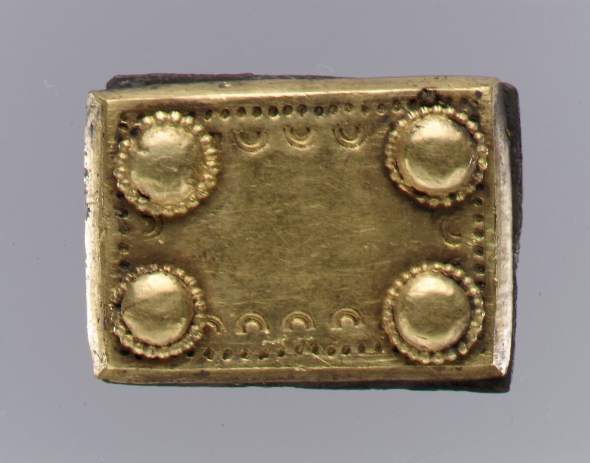 This group of objects was found in the grave of a Langobardic horseman, who was buried in his warrior dress, with weapons, shield, helmet, and the fittings for his horse. What remains are the many gold pieces that would have ornamented his clothing and equipment, and they attest to the great wealth of the Langobardic aristocracy within a generation of settling in Italy.